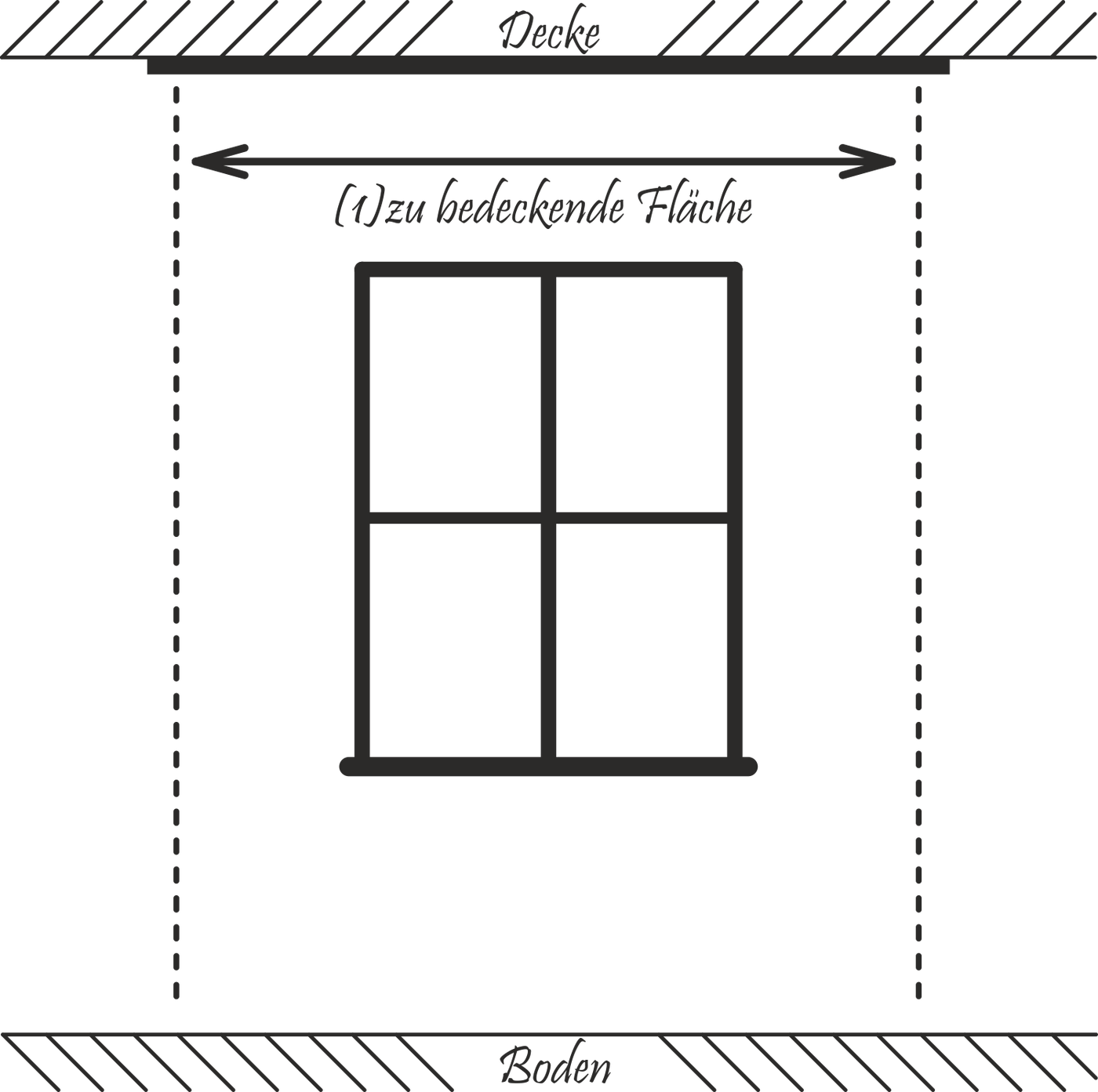 Miss die Fläche die der Vorhang abdecken soll (1). Normalerweise ca. 30 cm links und rechts des Fensters oder so breit wie die Vorhangstange/Schiene ist. Trage diesen Wert dann oben bei der Breite ein.