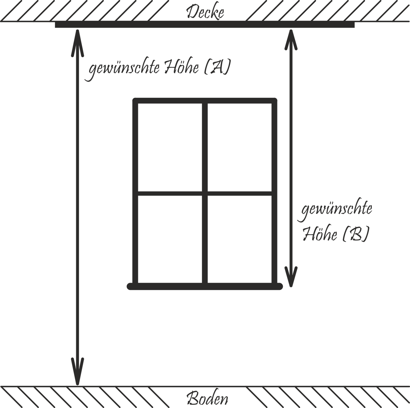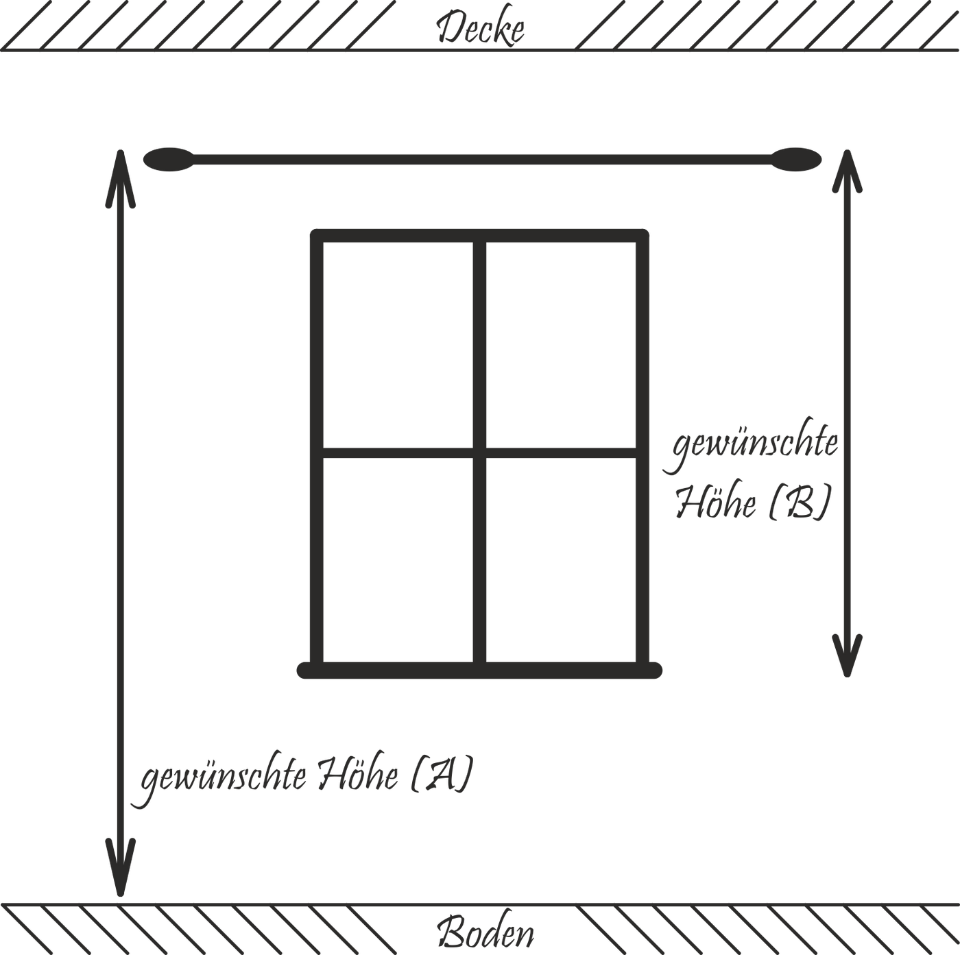 Miss von der Unterkante Schiene bis zur gewünschten Höhe. Übliche Höhen sind bis knapp über dem Boden (2-3cm) (A) oder 2-3cm unter die Unterkante Fensterbrett (B). Sollte das Fensterbrett zu weit herausragen, sodass der Vorhang nicht überlappen kann, miss bis knapp über das Fensterbrett.